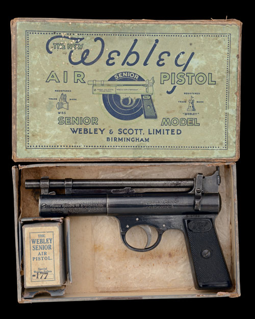 circa 1933, with 7 1/4in. rifled barrel, adjustable rear-sight blade, blued air-chamber with various world patents and 'THE WEBLEY SENIOR, MADE IN ENGLAND' the reverse with the pre-war Birmingham address, three-pin trigger-unit and chequered black bakelite straight grips embossed with 'W&S', the pistol in good condition with some light rubbing to high-spots; TOGETHER WITH its original card carton with instruction label to inside of lid, an empty grey card carton of 'THE WEBLEY SENIOR AIR PISTOL SPECIAL WEBLEY PELLETS .177' and remnants of the original grease-proof wrapping, the outside of carton with pale blue label on grey paper depicting the pistol without a trigger adjustment screw, some staining and scuffs, one end of the lower tray split