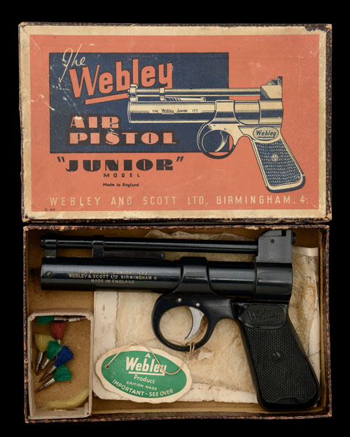 circa 1963, with 6in. smooth-bore barrel, adjustable rear-sight blade, blued air-chamber with the 'Birmingham '4'' address, two-pin trigger-unit and chequered black bakelite grips embossed with 'WEBLEY', the pistol near mint and appearing unfired with original trigger-guard 'green label' swing ticket; TOGETHER WITH its original card carton with instruction label to inside of lid, a spares brochure (distressed) and remnants of the original grease-proof wrapping, the outside of carton with orange label on brown pebbled paper, some mild staining and scuffs