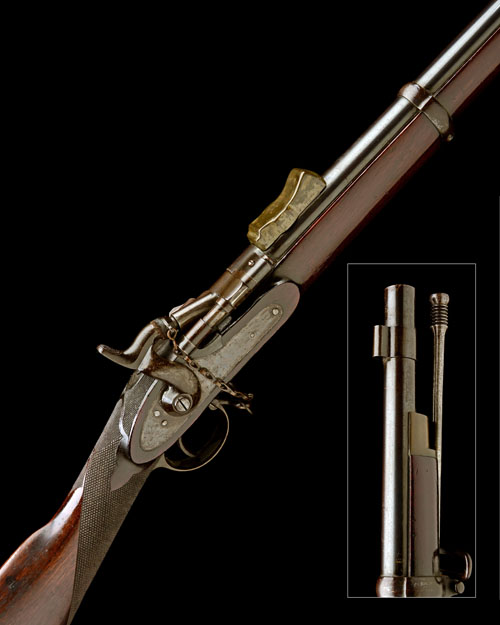 circa 1870, with blued 36 1/2in. barrel, block and blade fore-sight with special spring-steel cover, elevating ladder rear-sight also with a lift-off spring-steel cover marked 'SNIDER' and stamped with a Victorian registration mark, flip-open breech-block marked with an arrow and 'SNIDER' trade-mark, spring-loaded thumb-catch, borderline engraved lock and hammer (much colour remaining), walnut three-quarter stock with chequered wrist, the chequering conducted in the Greener fashion, brass furniture, three iron barrel-bands and jag-ended iron ramrod, much finish remaining throughout