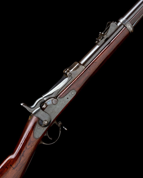 with 32 1/2in. blued barrel with blade fore-sight, Buffington rear-sight, hinged breech-block engraved 'US MODEL1884', plain flat lock signed 'SPRINGFIELD US', plain hammer, walnut full-stock, iron furniture including heel-plate, much finish remaining, missing clearing rod