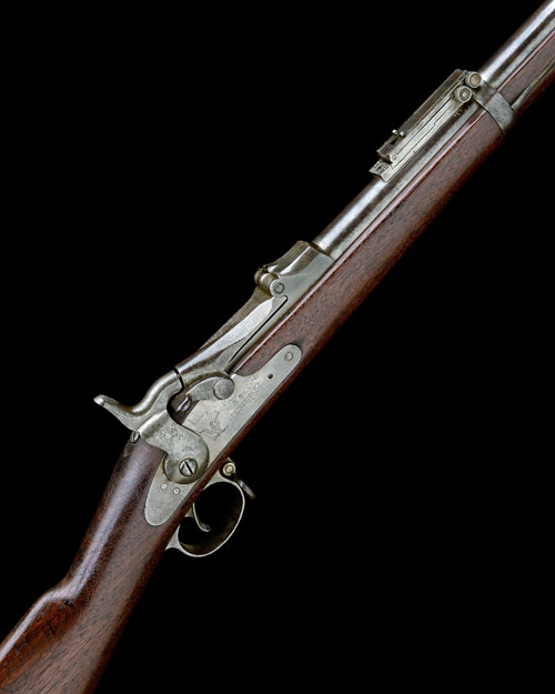 circa 1888, with 32 1/2in. blued barrel, block and blade fore-sight, micro-adjustable complex rear-sight, colour-hardened flip-up breech-block dated 1884, plain flat lock signed 'SPRINGFIELD US', plain hammer, walnut full-stock with traces of inspectors cartouche stamped opposite lock, iron furniture including heel-plate with swivelling door for tools (absent), two iron barrel-bands, sliding spike-bayonet with twin retaining catches concealed in the fore-end, strong traces of finish throughout