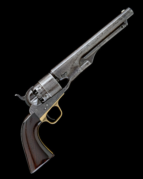 for 1862, with 8in. barrel signed 'ADDRESS COL SAML COLT NEW-YORK U.S. AMERICA', plain stepped cylinder with traces of roll-engraved scene, open iron frame with three screws and marked 'COLT'S PATENT', brass trigger-guard, iron back-strap, one-piece walnut grip and articulated under-barrel rammer