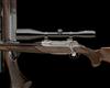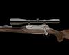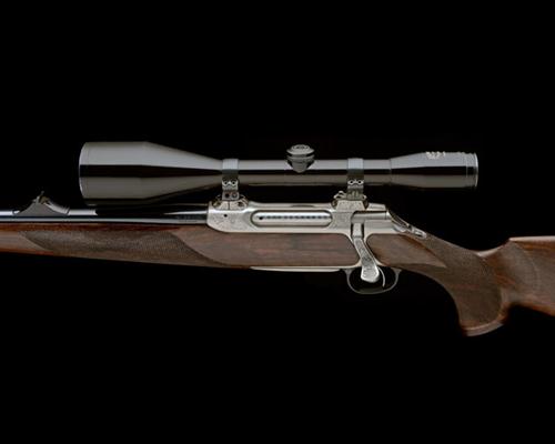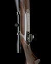 23 3/4in. nitro barrel with block-mounted open sights and ramp-mounted blade fore-sight, the receiver mounted with a Schmidt & Bender 8x56 telescopic sight in quickly-detachable mounts, bright finish with oak leaf motifs, detachable magazine with oak leaf engraved steel base, set trigger, highly-figured pistolgrip stock with cheekpiece, palm swell, quickly-detachable sling swivels, 14 1/8in. pull including 5/8in. ventilated rubber recoil pad