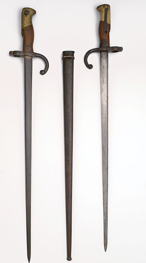 TWO BAYONETS FOR THE FRENCH GRAS RIFLE, both dated 1877, one minus scabbard and darkly stained