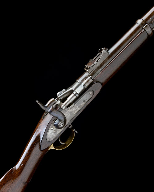 circa 1870, with 36 1/2in. barrel, block and blade fore-sight, elevating ladder rear-sight, flip-open breech-block with spring-loaded thumb-catch, borderline engraved lock and hammer, walnut three-quarter stock with three iron barrel-bands, brass furniture and jag-ended iron clearing rod