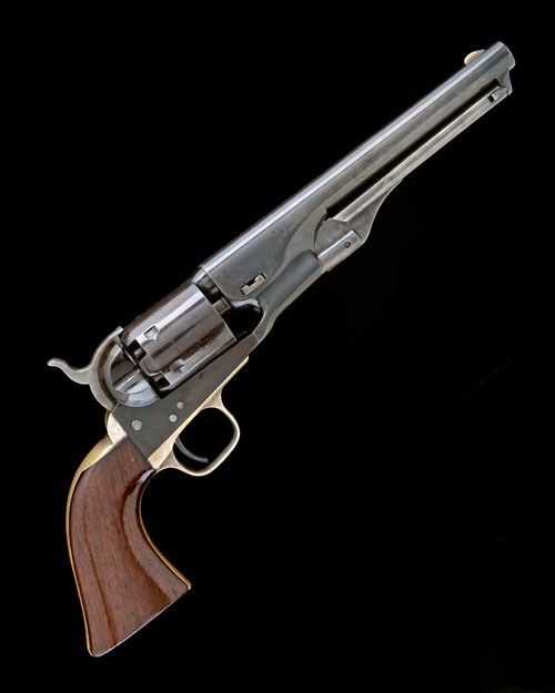 manufactured 1863, with round 7 1/2in. barrel signed 'ADDRESS COL SAML COLT NEW-YORK U.S.AMERICA', plain cylinder, open frame marked 'COLT'S PATENT', brass grip-straps and trigger-guard (traces of plating), walnut one-piece grip, the whole re-finished TOGETHER WITH a rare period moulded leather holster for this pistol (some scuffs and distressing)
