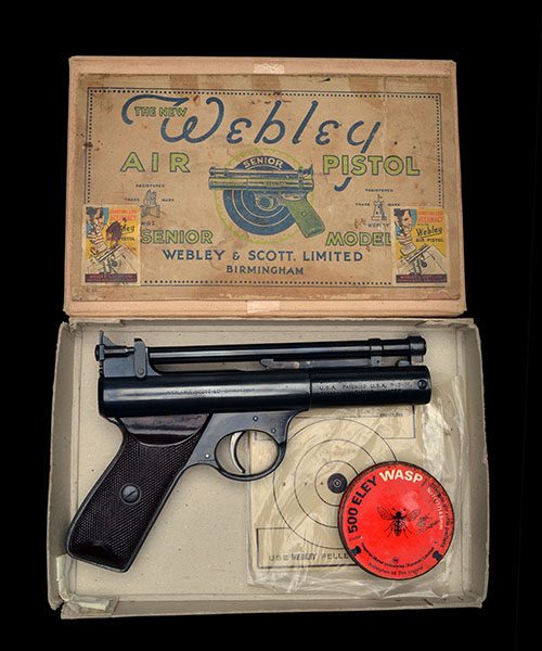 circa 1936, with 6 1/2in. rifled barrel, adjustable rear-sight blade, blued air-chamber marked 'THE WEBLEY SENIOR, MADE IN ENGLAND', the reverse with the Birmingham address and three lines of patents, three-pin trigger-unit and chequered brown bakelite grips, the pistol in excellent condition with some light storage marks but appearing little-used; TOGETHER WITH the lid of its original card carton with instruction label to reverse and a lated card box