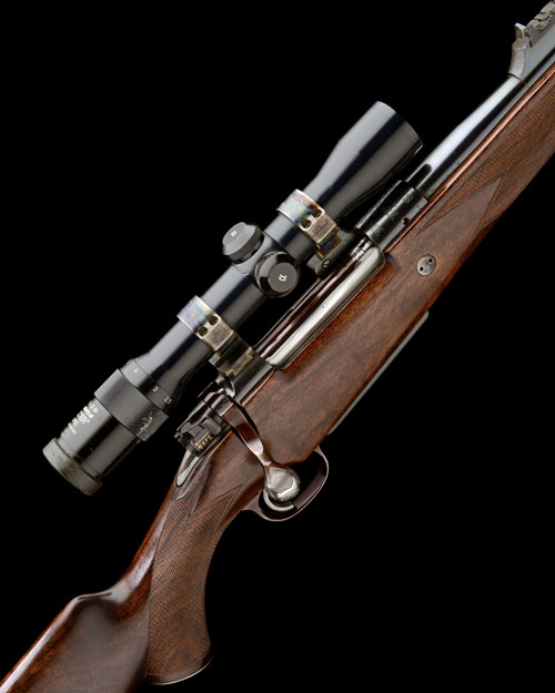 22 1/8in. nitro barrel engraved in gothic script 'J. RIGBY & CO. LONDON. ENGLAND.', block-mounted open sights with two folding leaf sights, gold-inlaid sight lines and marked '100', '200' and '300', block-mounted bead fore-sight with fold-over protector hood, receiver ring engraved in bold type 'RIGBY'S SPECIAL 416 BORE FOR BIG GAME', receiver mounted with a Docter 1,2-5x32 M spherical telescopic sight in colour-hardened quickly-detachable mounts, rings engraved 'J. RIGBY & CO. LONDON.', and 'CAL .416 RIGBY NO. 6846', solid side wall engraved 'J. RIGBY & CO. LONDON. ENGLAND.', colour-hardened recoil block, hinged floorplate with push button release and gold-inlaid with the calibre designation in a flowing banner, bolt handle with chequered panels, repair to bolt head, full length pistolgrip stock with cheekpiece, steel fore-end finial and pistolgrip-cap, sling eyes, 14 3/4in. pull including 3/8in. rubber recoil pad
