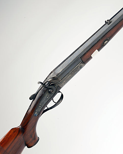 J. RIGBY & CO. .450 / .400 (2 3/8IN.) BLACK POWDER EXPRESS SINGLE-BARRELLED TOPLEVER HAMMER RIFLE, serial no. 15281, 26in. octagonal steel barrel, partially matted top flay engraved in gothic script 'JOHN RIGBY & CO. DUBLIN & OXFORD', open-sights and folding leaf sight marked for 150 and 250 yards and with white metal inlaid sight lines, bead fore-sight, non-rebounding back-action lock, triggerguard with repairs, native replacement pistolgrip stock and fore-end wood