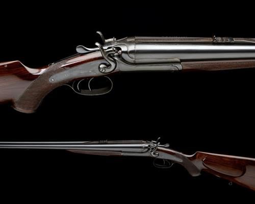 26in. Krupp-steel nitro barrels, file cut sight rib with open sights and two folding leaf sights, gold-inlaid sight-lines and marked for 100, 200 and 300 yards, ramp-mounted bead fore-sight, tubes engraved 'R.B. RODDA & CO. CALCUTTA & BIRMINGHAM', treble-grip action with carved percussion fences, rebounding back-action locks, border engraving, blacked finish, triggerguard tang repaired, 14 1/4in. figured replacement pistolgrip stock with cheekpiece, horn pistolgrip-cap, sling eyes and including 1/2in. rubber recoil pad, replacement fore-end wood, Deeley & Edge patent release catch, weight 10lb. 15oz.