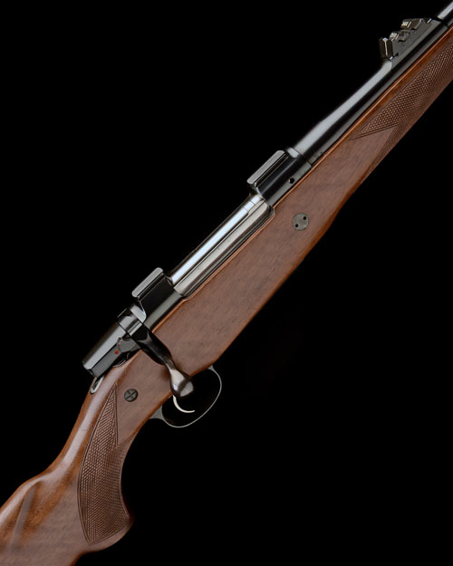 23 1/8in. nitro barrel with block-mounted open sights and two folding leaf sights, ramp-mounted bead fore-sight with hood, recoil blocks, hinged floorplate with push button release, pistolgrip stock with sling swivels, 14 3/4in. pull including 1 1/4in. rubber recoil pad
