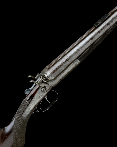 28in. black powder only damascus barrels, raised matt rib with three folding leaf sights and ramped bead fore-sight, tubes engraved 'R.B. RODDA & CO. LONDON. AND 7 & 8 DALHOUSIE SQUARE CALCUTTA', 2 1/2in. shot chamber, bored approx. true cyl. choke, rifled barrel with Henry patent rifling, carved percussion fences, rebounding back-action locks, border and acanthus scroll engraving, retaining very slight traces of original colour-hardening, 14 1/2in. figured semi-pistolgrip stock including 7/8in. rubber recoil pad, fore-end with Scott 1876 patent release lever, weight 8lb. 14oz.