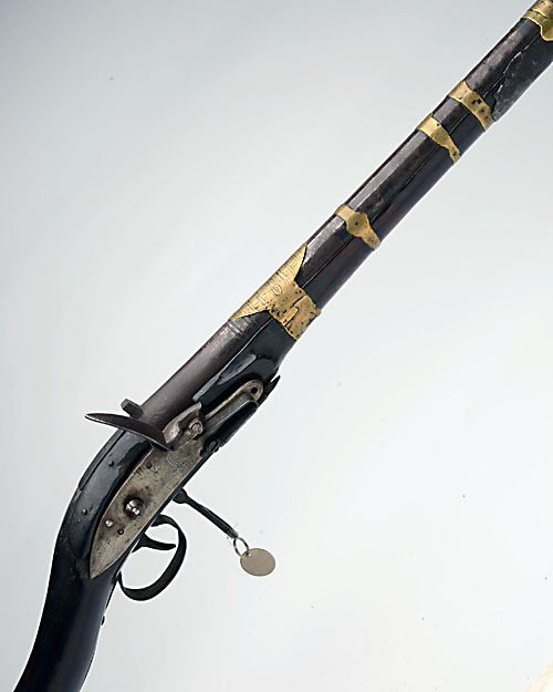 EX SMALL ARMS SCHOOL CORPS WEAPONS COLLECTION, A 20-BORE FLINTLOCK JEZAIL, ref. no. 1204, Pakistani, circa 1800, with round 40in. barrel, military lock from an East India Company brown-bess musket (hammer missing), wood full-stock (loss to wood opposite lock), Sind-style butt and brass barrel-bands, other losses, with its weapons collection identity disk