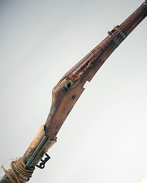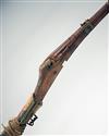EX SMALL ARMS SCHOOL CORPS WEAPONS COLLECTION A 28-BORE MATCHLOCK JEZAIL, ref. no. 3181, Sudanese circa 1850 with earlier 43in. carved fluted barrel, wood full-stock (losses), brass barrel bands and remenants of velum covering to butt, ironwork rusted, complete with its weapons collection identity disk