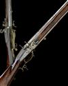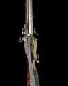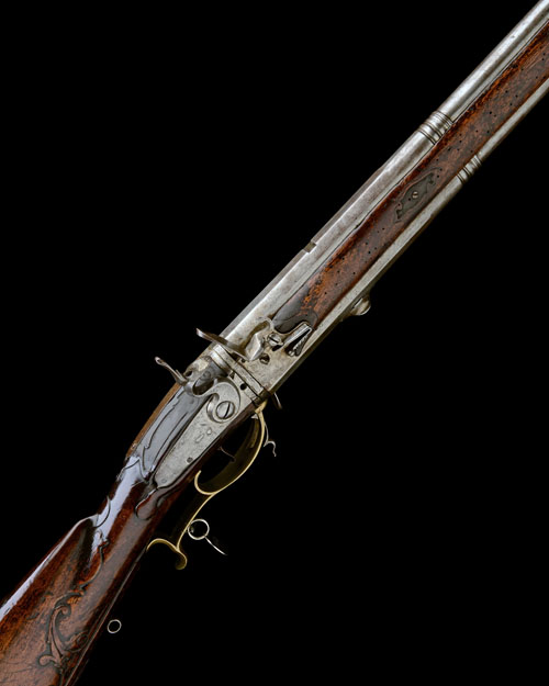 circa 1740, with 32 1/4in. triple-staged barrels, applied crescent fore-sights, pinched leaf rear-sight (one absent), carved bands at the intersection, the breech-end of the barrels with half-lockplates mounting the lozenge pans, frizzens and engraved frizzen-springs, the right hand side behind breech with the lockplate (traces of engraving, possible trace of signature), top-jaw and screw missing to hammer, walnut butt-stock with carved borders around the top-tang, carved panels to the wrist and further carving around the raised cheek-piece, brass heel-plate with bulbous heel, brass side-plate, faceted brass trigger-guard with raised tang and finger-spur, the front pillar of the bow containing the turn-over release catch, full-length walnut slats forming the fore-end, one with provision for ramrod (missing), the whole cleaned with small losses, some cracks, splits and worm damage to fore-end wood, loose at action joint, the cheek-piece bearing the Weapons Collection plaque and the identity disk attached to the trigger-guard