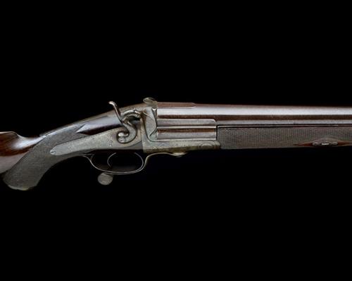 44in. bold damascus barrel with short sight flat, barrel engraved 'THOS. NORFOLK. MAKER. BURY ST. EDMUNDS', finely carved serpentine fence, Jones patent rotary-underlever, non-rebounding back action lock with dolphin hammer, broad button striker, border and acanthus scroll engraving, the action with wetland scenes of hound and fowl, retaining traces of colour-hardening, 14 5/8in. pistolgrip stock with vortically carved horn pistolgrip-cap, horn buttplate, 12in. fore-end with horn finial, weight 11lb. 15oz.