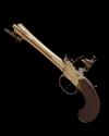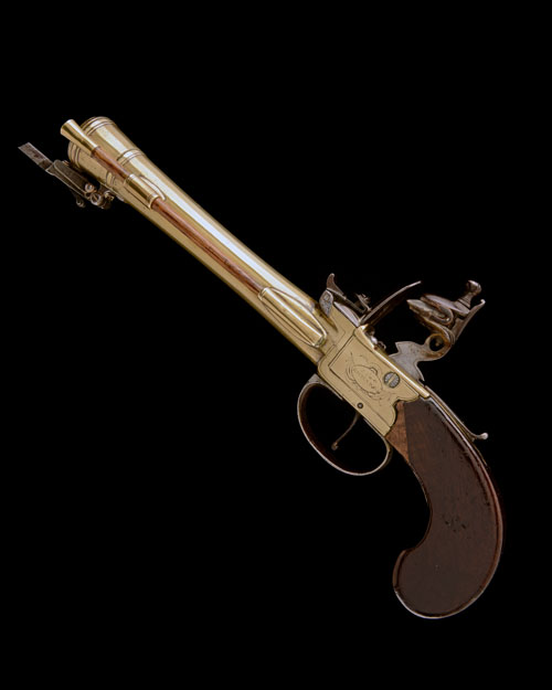 circa 1780, with 7in. heavily swamped brass barrel, twin moulded bands at muzzle, private proofs at breech, squared boxlock action, the left side signed 'J&W RICHARDS', the right 'LONDON' both within an oval within a stand of flags, central hammer with sliding safe to top-tang, plain walnut slab-sided grip (inlets at head), sliding iron trigger-guard bow originally retaining the under-barrel sprung bayonet of triangular cross-section (last 4in. of tip broken off but present) and side-mounted brass-tipped wood ramrod