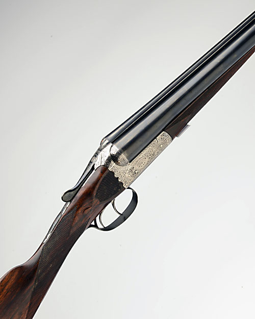 ARMSTRONG & CO. 12-BORE BOXLOCK EJECTOR, serial no. 41243, 27 1/2in. nitro reproved barrels, 2 1/2in. chambers, bored approx. true cyl. and full choke, scroll-backed treble-grip action, automatic safety, border and acanthus scroll engraving, bright finish, 14 3/4in. stock with chequered recessed side panels, including 3/4in. ventilated rubber recoil pad