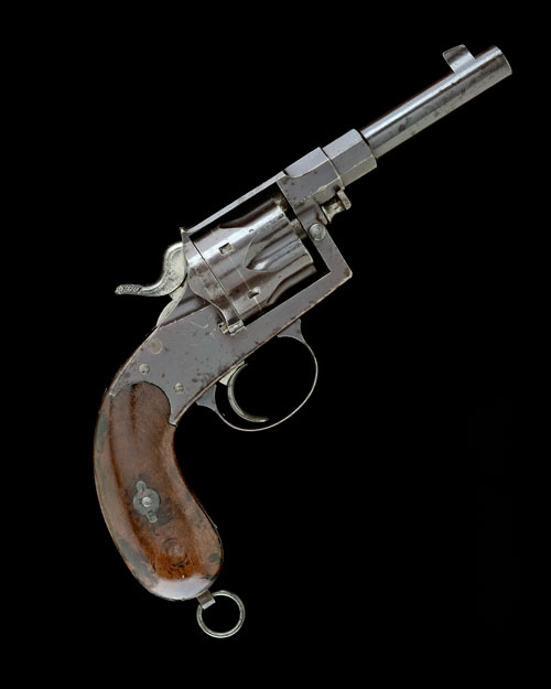 German, undated but circa 1890, with triple-stage 4 3/4in. barrel, wedge fore-sight, standing-notch rear-sight, cylinder with 'church-window' flutes, plain frame with side-safety, loading gate to right hand side, smooth walnut bag-shaped grips, lanyard ring at pommel, the back-strap stamped 'B.R.I.M.3.4.', much finish remaining