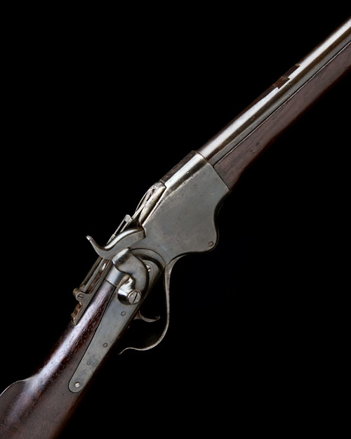 circa 1863-65, with round 28in. barrel, dove-tailed fore-sight blade and rear-sight (rearsight missing), plain receiver with under-lever opening, the top of receiver stamped 'SPENCER REPEATING RIFLE CO. BOSTON, MASS, PAT'D MARCH 6 1860', plain back-action sidelock with external hammer, tangent rear-sight fitted to top-tang, walnut straight-hand butt-stock with magazine tube concealed in the iron heel-plate, walnut splinter fore-end with metal tip, re-finished