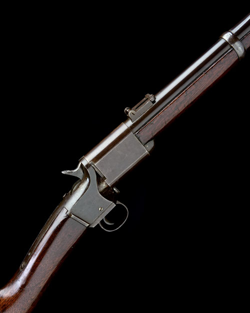 manufactured 1864-65, with blued 30in. round barrel, pinched blade fore-sight, elevating ladder rear-sight, slab-sided rounded-top and bottom breech marked 'KENTUCKY', slab-sided central hammer receiver signed 'MERIDEN MAN.FG. CO., MERIDEN, CONN.', the top-tang marked 'TRIPLET & SCOTT PATENT DEC. 6 1864' and mounted with the barrel-release button, sprung trapdoor for the concealed tubular magazine in the butt, walnut butt-stock with iron heel-plate, sling swivels mounted at heel and toe, walnut splinter fore-end with singular iron barrel-band