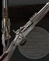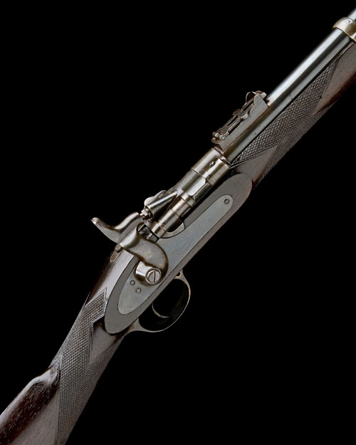 circa 1860, with blued 36 1/2in. barrel, block and blade fore-sight, elevating ladder rear-sight, flip-open breech-block signed 'JAS KERR & CO, 54 KING WILLIAM ST E.C.' together with a large '3' and 'L.A.C.' spring-loaded thumb-catch, plain lock signed as the action, plain hammer, walnut three-quarter stock with chequered wrist and fore-end, large silver oval inlet to left hand side of butt inscribed 'PRESENTED BY WM. HARRISON, LATE CAPTAIN 2ND LANCASHIRE VOLUNTEER RIFLES, TO JACOB RILEY, THE 2ND BEST SHOT OF NO.3 COMPANY BLACKBURN, OCTOBER 26TH 1860', brass furniture, three iron barrel-bands and jag-ended iron ramrod