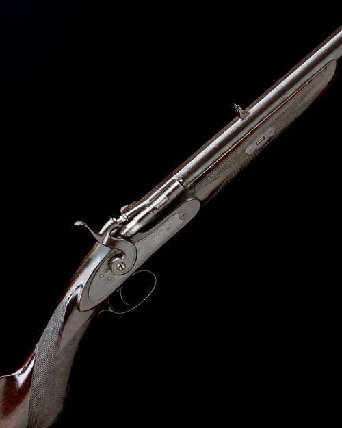 circa 1867, with 26in. barrel, matted flat sighting plane, the left hand side of barrel signed at breech 'W.C. SCOTT & SON LONDON, AMMUNITION 450 No.1', dove-tailed bead fore-sight, dove-tailed standing notch rear-sight with two additional folding leaves, flip-open Birmingham proved action with sprung locking catch, borderline engraved lock signed 'W.C. SCOTT & SON', chequered half-pistol walnut half-stock, iron furniture and horn fore-end tip