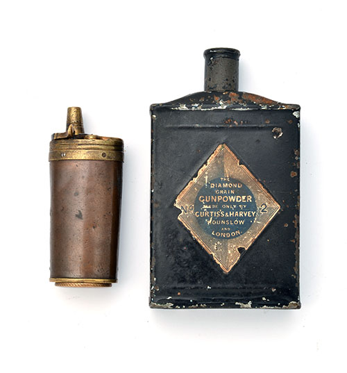 A THREE-WAY POWDER-FLASK AND A VINTAGE POWDER-TIN, the first from a pair of flintlock pocket-pistols, some dents to body, the second of rectangular shape, painted black and bearing a Curtis's & Harvey label