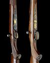 the first a a Baerten-engraved 7x64mm 'Modele Du Millenaire', serial no. 001, 24 1/4in. nitro barrel engraved in script 'H. Dumoulin & Fils Liege Belgique. Modele du Millenaire. a l'intention du docteur P. Tock', block-mounted open sights marked for 100 metres and with gold triangular sighting detail, ramp-mounted bead fore-sight, receiver engraved with bold acanthus scrollwork with chequerboard patterning and the receiver ring gold-inlaid with a Walloon cockerel with 'LIEGE. 1000' above and below, the sidewall gold-inlaid '980 - 1980', floral engraved recoil block, hinged floorplate with push button release, bold acanthus scroll engraving surrounding a central relief engraved and gold-inlaid motif of the Liege coat of arms, inscribed 'MILLENAIRE - LIEGE', signed 'C. Baerten', the triggerguard relief engraved and gold-inlaid with 'Le Perron', figured pistolgrip stock with sculpted cheekpiece, hogsback comb, steel pistolgrip-cap gold-inlaid 'PT', engraved steel heel and toe plates, 15 1/4in. pull;
