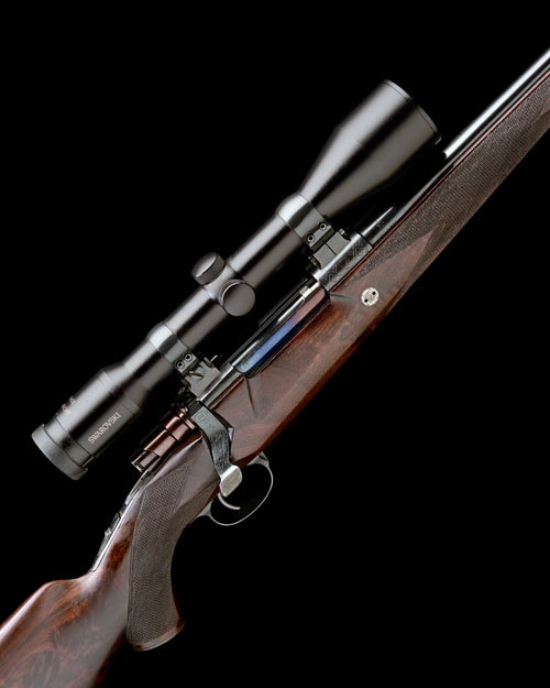 23 7/8in. unsighted nitro barrel, engraved 'J. ROBERTS & SON. 53, ST. MARTINS LANE. LONDON. W.C.2.' and with the calibre designation, receiver (with thumb cutout) mounted with a Swarovski Habicht 8x50 telescopic sight, receiver ring engraved with celtic designs, side wall with 'GEW 98', tang safety with gold-inlaid 'SAFE' detail, flattened bolt handle with chequered knob and engraved with further celtic motifs, floorplate with push button release, with a central flowing banner inscribed with the calibre designation and fully engraved with celtic strapwork, celtic engraved recoil blocks, highly-figured pistolgrip stock (crack at hand) with cheekpiece, horn pistolgrip-cap and fore-end finial, sling swivels, 14 1/4in. pull including 5/8in. rubber recoil pad, in its brass-cornered full-length canvas case with some accessories and sighting targets