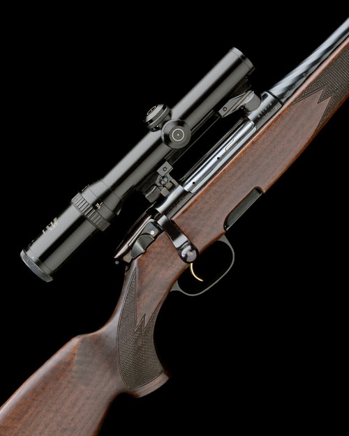 20in. fluted nitro barrel with block-mounted open sights and ramp-mounted blade fore-sight, the receiver mounted with a Schmidt & Bender 1 1/4-4x20 telescopic sight in quickly-detachable mounts, detachable box magazine, gold-washed set trigger, full length pistolgrip stock with cheekpiece, palm swell, hogsback comb, sling swivels, 14 1/8in. pull including 7/8in. ventilated rubber recoil pad