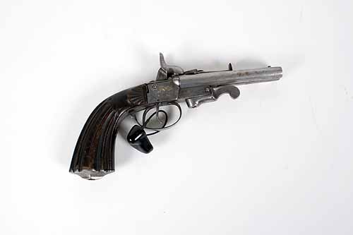 * A 9mm PINFIRE DOUBLE-BARRELLED PISTOL, UNSIGNED, serial no. 12365, Belgian, circa 1865, with hinged side by side 4 1/4in. sighted barrels, sliding pin protector to the top of barrels, boxlock action with central hammers, walnut fluted butt, guarded triggers and swing under-lever opening
