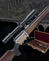 lightweight alloy action with manual cocking piece, bold acanthus scroll engraving surrounded game scenes of red deer and wild boar and hound carved in relief, signed 'R. Kaufmann', 15 1/4in. well-figured pistolgrip stock with sculpted cheekpiece, pistolgrip-cap, engraved hinged ammunition trap and including 1 1/8in. ventilated rubber recoil pad, weight 8lb. 13oz. (.243W barrel) and 7lb. 13oz. (.308 barrel), in its fully fitted brass-cornered leather case with leather and velvet lined interior