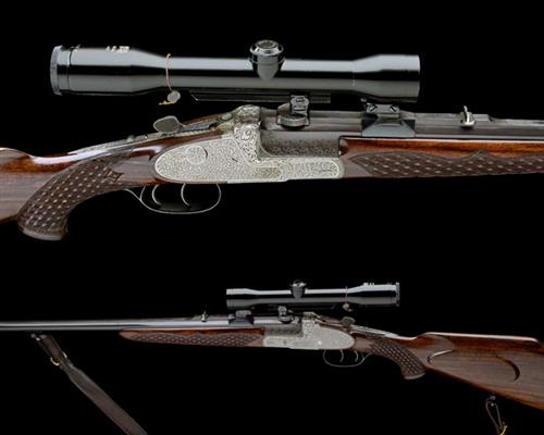 25 7/8in. nitro octagonal to round barrel, matt sight rib with open sights and ramp-mounted bead fore-sight, the breech end with Germanic scrollwork and engraved 'WAFFEN FRANKONIA WURZBURG', mounted with a Hensoldt Diatal 4x32 telescopic sight in quickly-detachable mounts, quadruple-grip action with ornately carved side bolsters, removable striker disc, toplever engraved 'FRANZ SODIA - FERLACH', manual safety, left hand lockplate with cocking-indicator, right hand dummy sideplate with concealed flush release lever, set triggers, fully engraved with bold Germanic scroll designs, bright and blued finish overall, 14 1/4in. figured pistolgrip stock with cheekpiece, monte carlo comb, pistolgrip-cap, sling swivels and including 7/8in. ventilated rubber recoil pad, weight 7lb. 15oz.