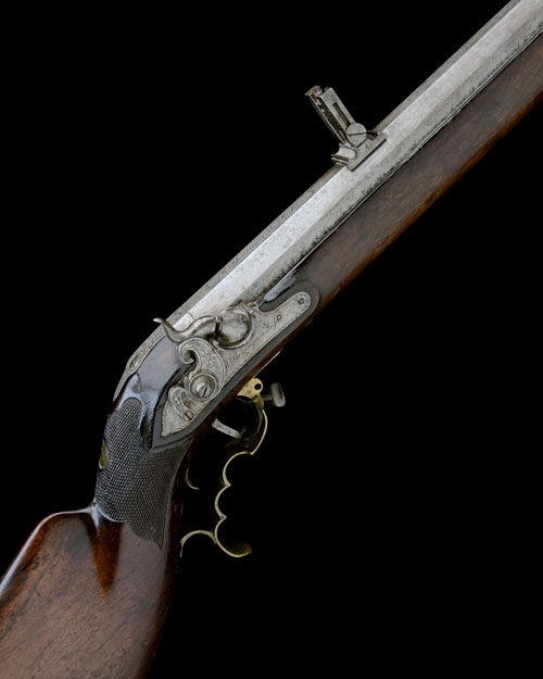 circa 1800 and converted from flintlock, with heavy octagonal 37 1/4in. barrel, the top-flat signed R. PFENINGER A STAFA' within an engraved cartouche, dove-tailed fore-sight, large standing adjustable rear-sight with pendulum, scroll engraved top-tang, small lock with border engraving signed 'R. PFENINGER A STAFA' and retaining part of the flintlock pan, carved hammer with swinging dog-safety, the opposite side with wing-nuts for quick release of lock, walnut full-stock with chequered panels at the wrist, shaped cheek-piece with brass inlay, heavy Swiss-style hooked brass butt-plate, brass finger-groover trigger-guard bow, double-set triggers, three barrel keys, brass fore-end tip and brass mounted wood ramrod, bayonet bar at muzzle, weight approximately 16lb.