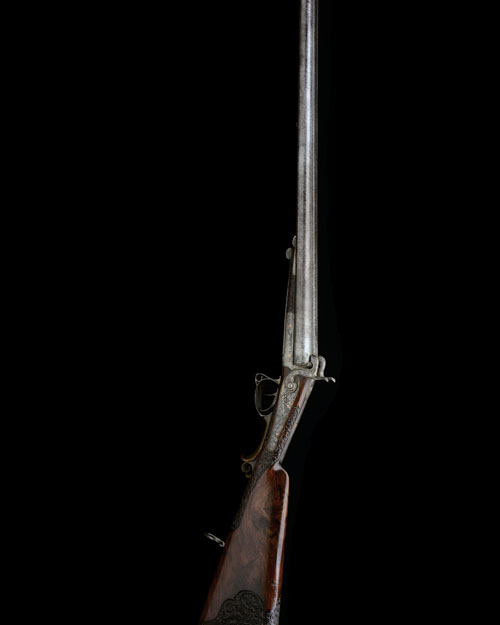 circa 1855, the barrels converted from muzzle-loading, with fine etched damascus 28in. barrels (one straight rifled), broad top-rib engraved with an 'A.M.' monogram at the breech, ramrod lip at muzzle and traces of threading in chambers, standing breech with carved hammer nose recesses, the top tang relief carved with a fox and engraved with scrolls and vine-leaves surround a repeated 'A.M.' monogram, the details picked out in gold, chisel carved vine and game scene engraved back-action locks with 'B.A. JIRKU' signed on the right hand lock and 'IN REICHENBERG' on the left, the details and wording picked out in gold, moulded scroll engraved hammers, highly figured walnut butt-stock, the wrist carved with running vines, the rear of butt similarly carved (shortened and re-extended with the original wood), engraved iron heel-plate, moulded horn cover to the trigger-guard tang, engraved trigger-guard bow with scrolled flat front, chisel-carved, rounded, vine-leaf and game scene engraved action body with gilded detail, large engraved 'Lefaucheux' swing under-lever, small walnut fore-end carved with running vines to the sides and barrel release catch to the front