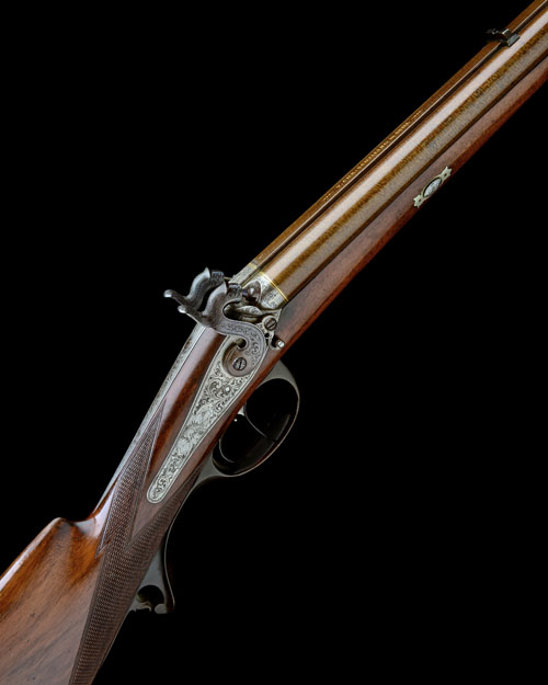 circa 1860, with re-browned twist iron 31in. barrels, the top-rib signed in gold 'V. CHR. SCHILLING IN SUHL', white metal dove-tailed fore-sight, standing notch rear-sight, gold line and engraving at breech, engraved long top-tang, borderline, acanthus scroll and gamescene engraved back action locks, blued scroll engraved hammers with engraved swinging safes to the front, walnut half-stock chequered at the wrist, polished patchbox to right side of butt engraved with a borderline, scrolls and a standing stag, raised cheek-piece with a deeply carved panel of scrolls behind, iron heel-plate with serial number, moulded horn trigger-guard bow and tang, engraved iron ramrod throat and replacement wood ramrod