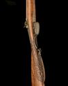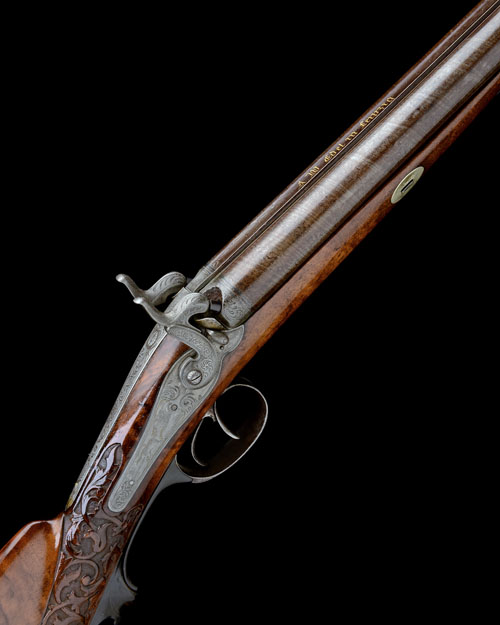 circa 1860, with browned ribbon-twist 34 1/2in. barrels, the top-rib in rose damascus and signed in gold 'A.W. EDEL IN LEIPZIG', bead fore-sight, silver lines and engraving at breech, engraved long top-tang, borderline and game scene engraved back action locks (traces of gilding), scroll engraved hammers with swinging safes to the front, walnut half-stock carved with scrolls at the wrist running into a mask at the pommel, raised cheek-piece with a deeply carved panel of scrolls behind, engraved iron heel-plate and trigger-guard, moulded horn trigger-guard tang cover, engraved iron ramrod throat and replacement wood ramrod
