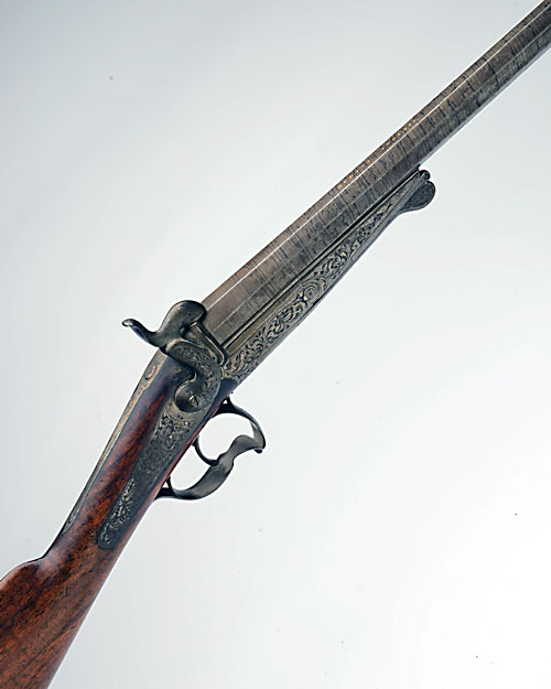 * A 16-BORE PINFIRE SINGLE-BARRELLED SPORTING GUN SIGNED RUBANS, serial no. 5500, circa 1860, with twist iron octagonal to round 37 1/2in. barrel signed in gold on the top-flat 'RUBANS ANGLAIS', scroll engraved back-action lock, walnut straight-hand butt-stock, scroll engraved action and Lefaucheax swing under-lever opening