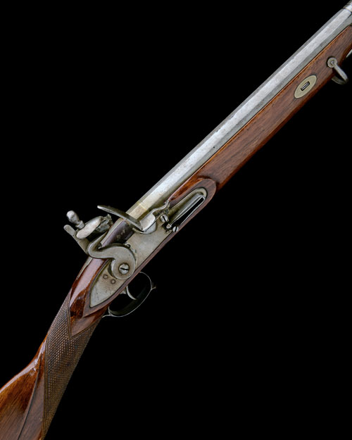 Belgian circa 1820, with two-stage 37in. barrel in the white, bead fore-sight, twin yellow metal bands at breech, plain lock with roller-bearing to the frizzen-spring, walnut half-stock chequered at the wrist, shaped cheek-piece, iron furniture including heel-plate and trigger-guard, brass mounts to the fore-end and wood under-barrel ramrod (tip broken off and missing)