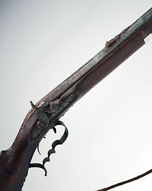 * A 28-BORE PERCUSSION MATCH-RIFLE, UNSIGNED, no visible serial number, Swiss or German, circa 1780, converted from flintlock with 33 1/2in. slightly swamped octagonal barrel, bar action radiused lock, Swiss-style full-stock with strongly curved heel-plate and set-triggers (at fault), period leather sling, the whole distressed with some furniture parts and the ramrod missing