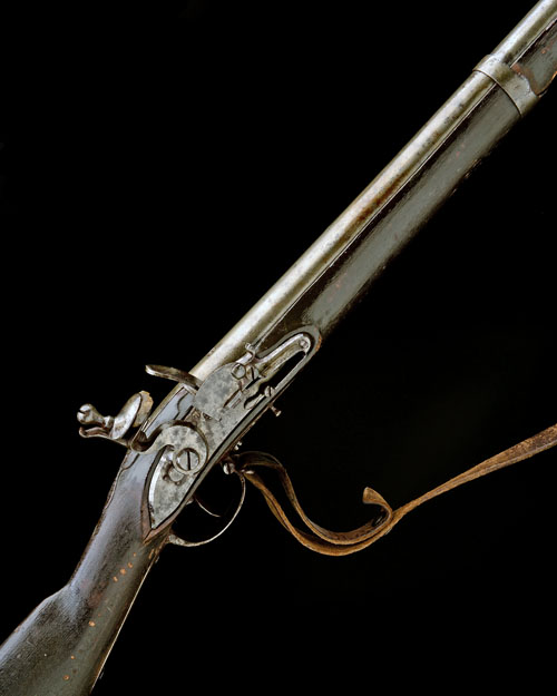 circa 1810, with round 44in. barrel, block fore-sight, makers stamp and 'IB' at breech, plain flat lockplate with bevelled edges, auxilliary flash-guard around the lozenge-shaped pan, walnut three-quarter stock with heavy iron furniture, three barrel-bands plus twin banded nose-cap with substantial ramrod throat and sprung catch for bayonet, together with its period leather sling (iron surfaces with shallow pitting, ramrod channel enlarged, ramrod missing)