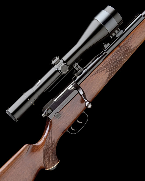 25 5/8in. nitro barrel with folding open sights and ramp-mounted bead fore-sight, the receiver mounted with a Zeiss Diavari-D 2,5-10x telescopic sight in quickly-detachable mounts, set triggers, pistolgrip stock with hogsback comb, cheekpiece, pistolgrip-cap, sling swivels, 15 1/2in. pull including 1 1/8in. ventilated rubber recoil pad