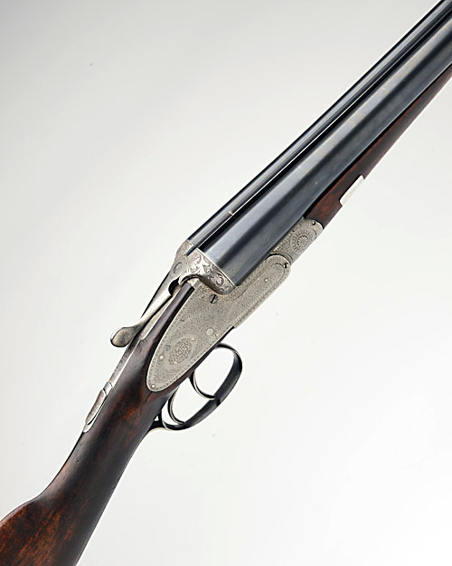 LLOYD & SON 12-BORE SIDELOCK EJECTOR, serial no. 4712, 28in. sleeved nitro barrels, 2 1/2in. chambers, bored approx. 1/4 and full choke, treble-grip action with carved leaf fences, automatic safety, bouquet and scroll engraving, brushed finish, 14 3/8in. figured stock