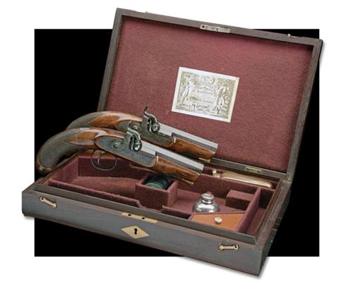 circa 1840, with twist iron, browned octagonal 4 1/2in. barrels, the top-flats signed '233 HOLBORN LONDON', bead fore-sights, scroll engraving to the coloured breech-blocks and top-tangs, moulded snails with platinum vents, border and scroll engraved bar-action locks signed 'PARKER FIELD & SONS' (strong traces of colour), borderline and scroll engraved hammers, walnut full-stocks with chequered bag-shaped butts, vacant rectangular silver escutcheons to wrists, later silver shield-shaped escutcheons behind the side-nails, blued trigger-guard bows and tangs, brass-tipped wood ramrod, much finish remaining throughout TOGETHER WITH a later box made and fitted for these pistols, reproduction parchment label to inside lid, compartmented and lined in burgundy baize and containing a number of period accessories including a turnscrew, mould and flask, the outer lid with inlet brass oval with flush fitting handle