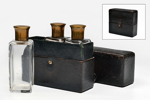 † A VINTAGE CASED TRAVELLING DECANTER SET,