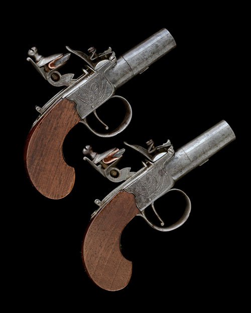 A PAIR OF 50-BORE FLINTLOCK POCKET-PISTOLS SIGNED BISSELL, no visible serial numbers,