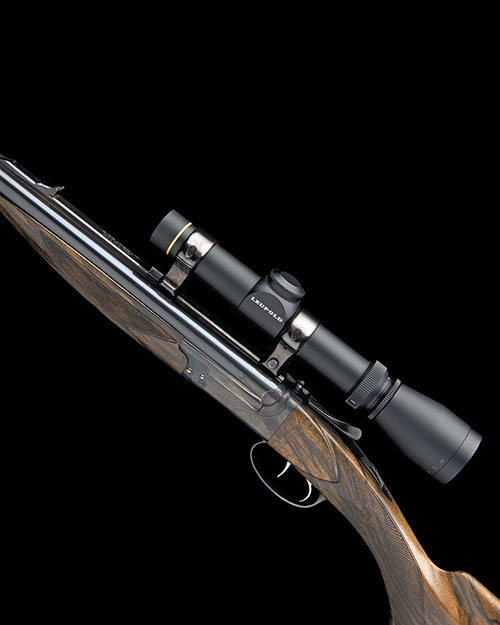 22 1/2in. nitro reproved partially ribless barrels, raised sight rib engraved 'B. BRADSHAW. DIANA, TX. .22 HORNET' with open sights, ramped bead fore-sight, the breech end mounted with a Leupold telescopic sight in quickly-detachable mounts, scale damascus steel action with carved fences and side-clips, removable striker discs, manual safety with brass 'FIRE' detail, toplever with peepsight, blacked finish, 15 1/4in. highly-figured pistolgrip stock with sling eyes and skeletal steel pistolgrip-cap and buttplate, fore-end release plate and iron also blacked damascus steel, weight 6lb. 15oz., in a Pelican 1700 desert tan rifle transit case