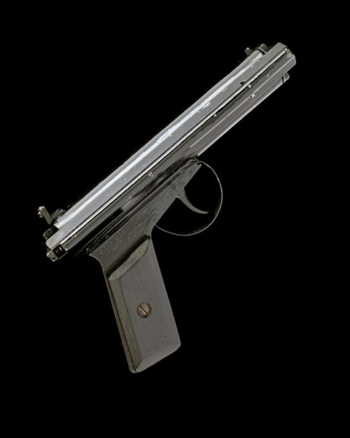 circa 1933, with concealed 7in. rifled barrel, plain air-chamber with small blade fore-sight and adjustable notch rear-sight, cast side-lever with release catch, solid frame with makers details and patents (obscured), replacement wood grips, sheet iron trigger-guard bow, the whole painted in black enamel