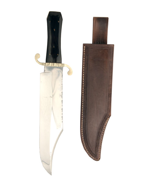 last quarter of the 20th century, with heavy 11 3/4in. clip-point blade, false edged for the last 5in. the remainder with carved scallop decoration, nickel-silver cross-guard with turned down and turned up quillions, polished horn handle fixed by six rivets, together with its makers tooled leather sheath